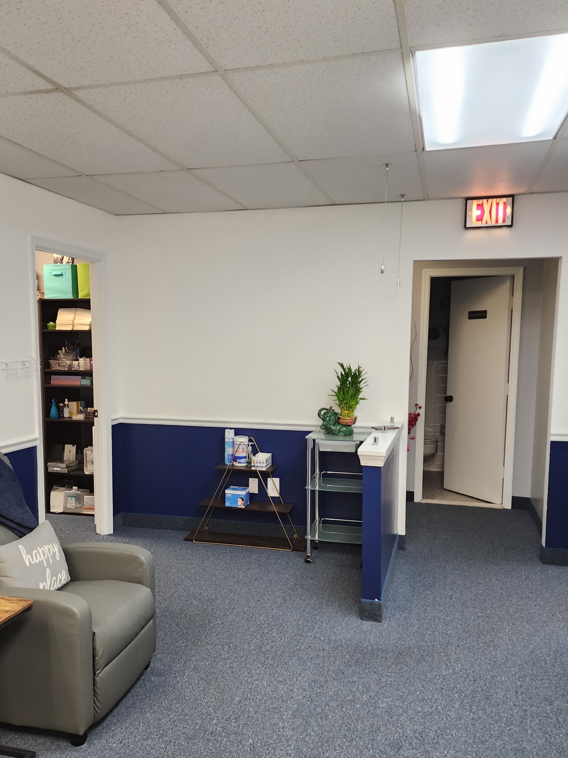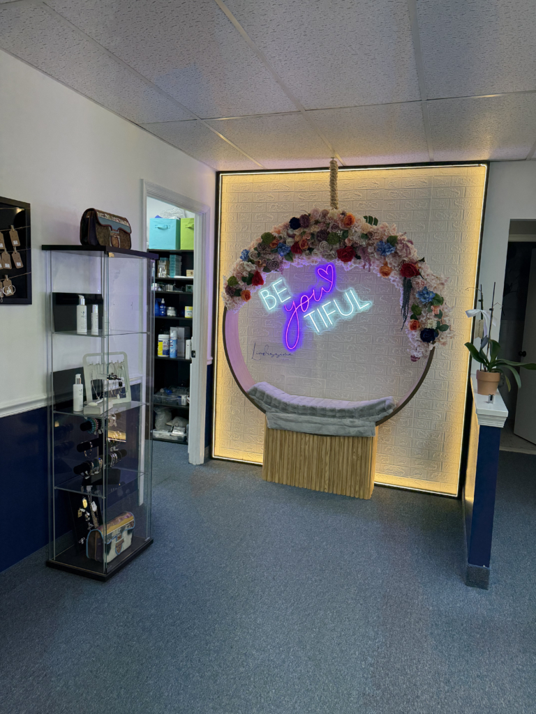 Custom-built accent wall for a med spa, designed with a built-in seating bench, integrated lighting, and a signature circular floral display. A polished, welcoming centerpiece that enhances the client experience and strengthens the brand’s visual identity.