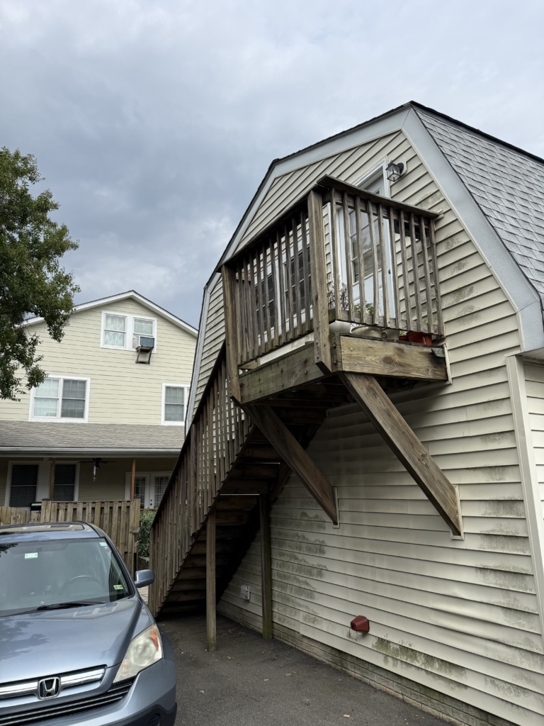 Custom-built deck stairs connected to the exterior door, designed for durability, functionality, and smooth access to the backyard. Clean, sturdy, and beautifully finished.
