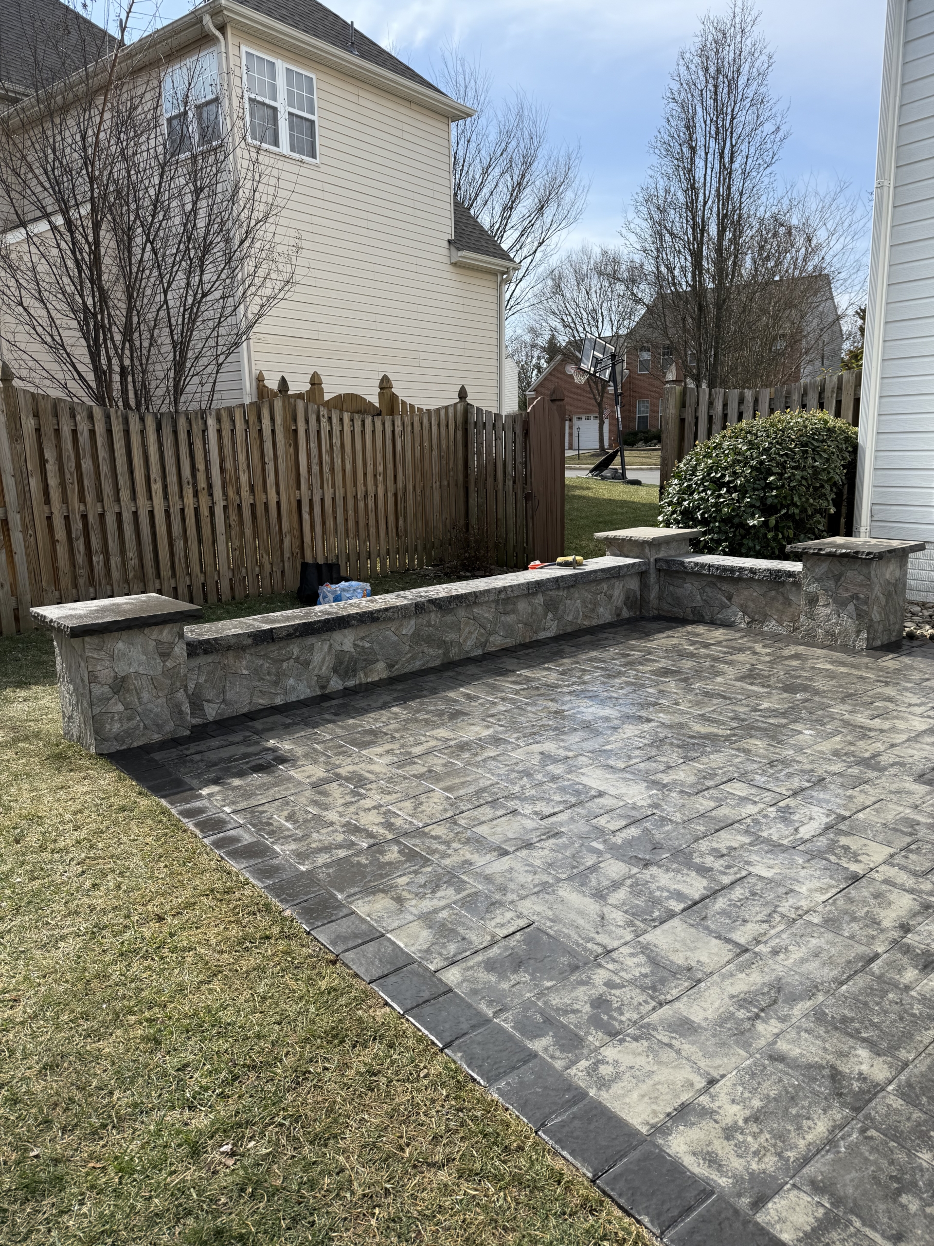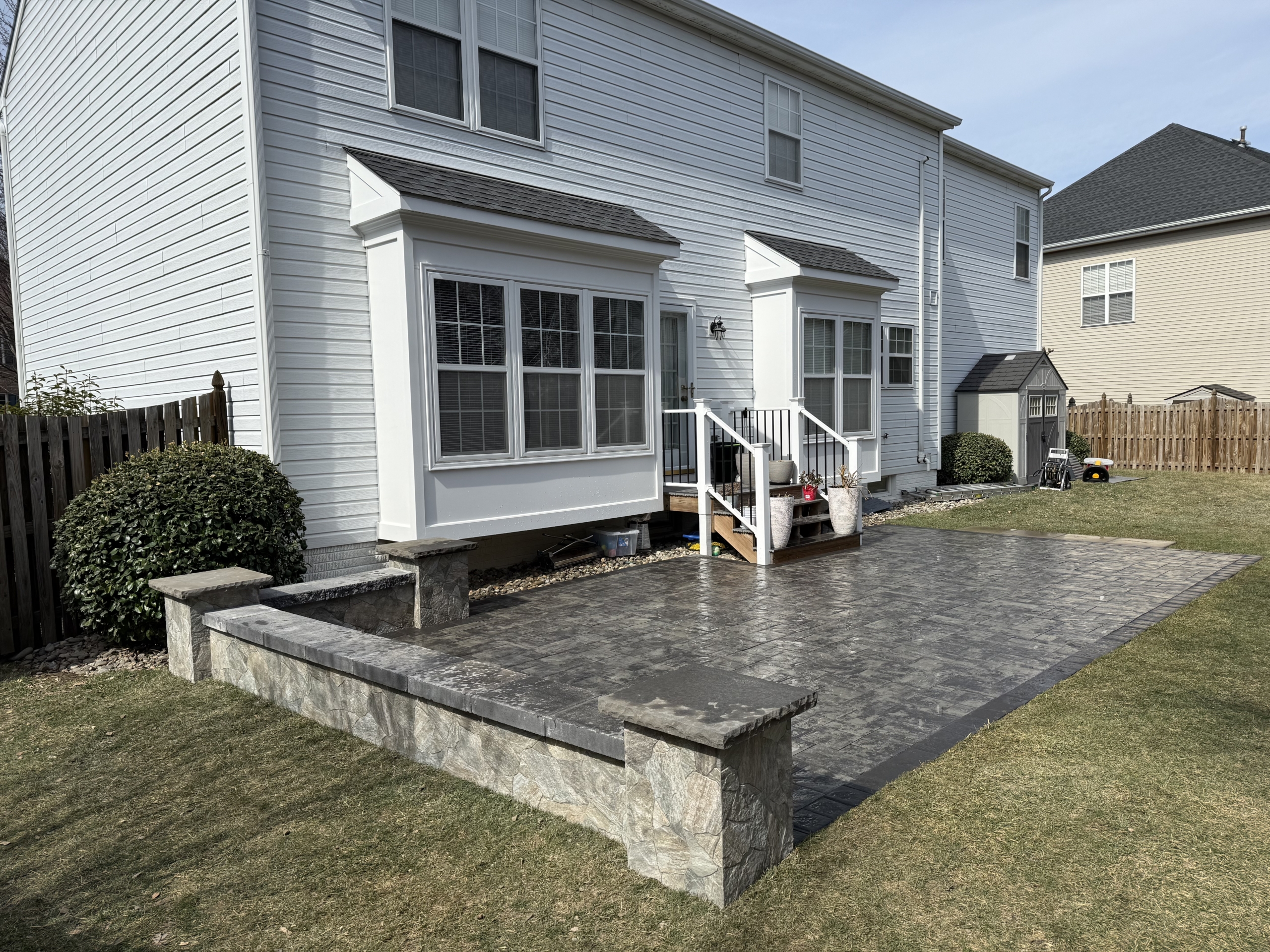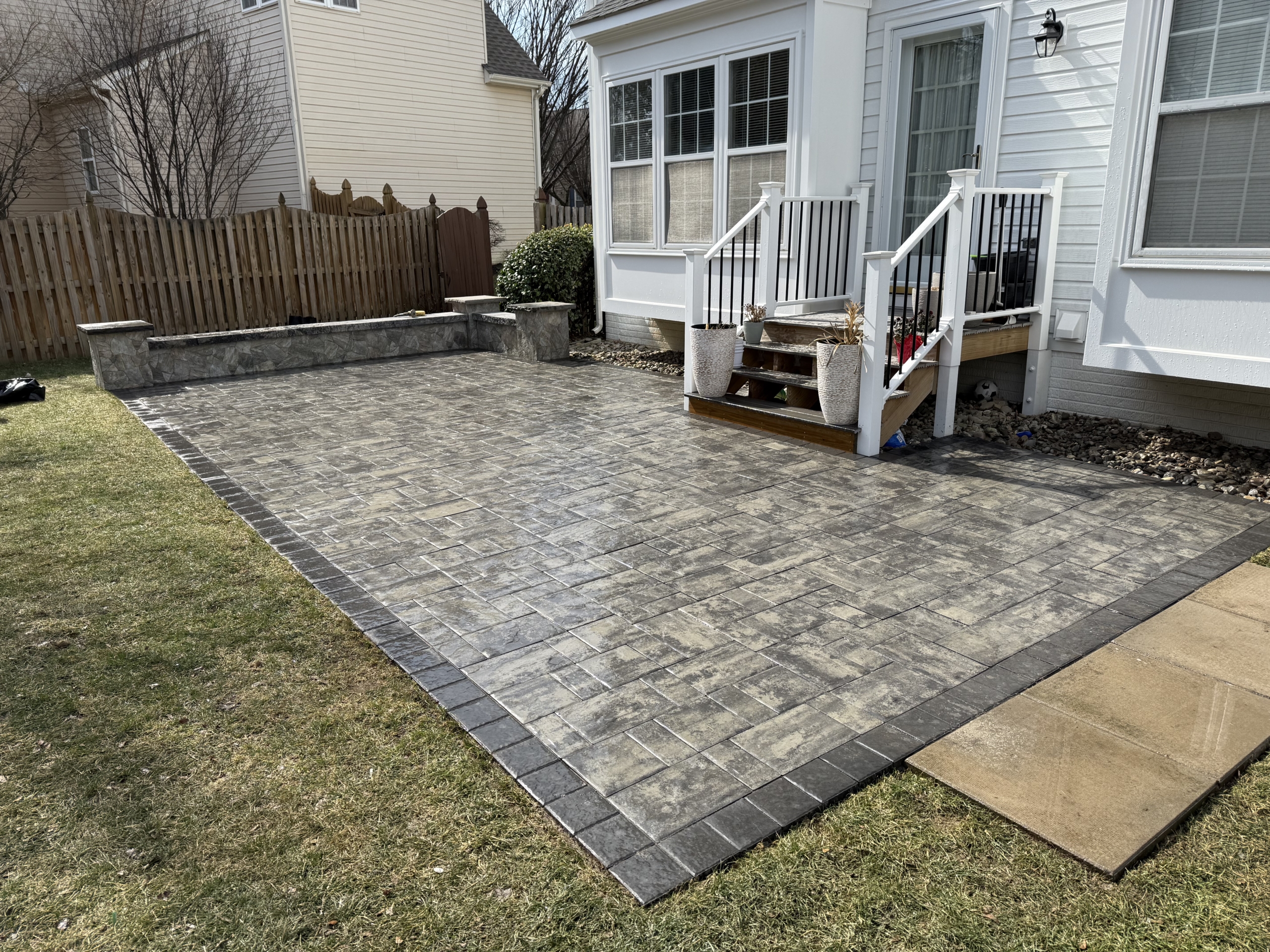 Ground-level concrete patio paired with custom wooden entry stairs built from the back entrance of the home. A clean, functional, and welcoming outdoor area designed for everyday use.